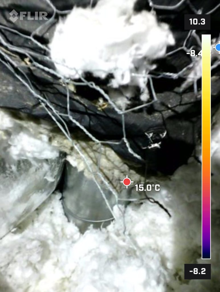 Puutteellinen höyrysulkumuovi, joka havaittiin lämpökameran avulla. Höyrysulkumuovina käytetty rakennusmuovia, jota ei ole tiivistetty.